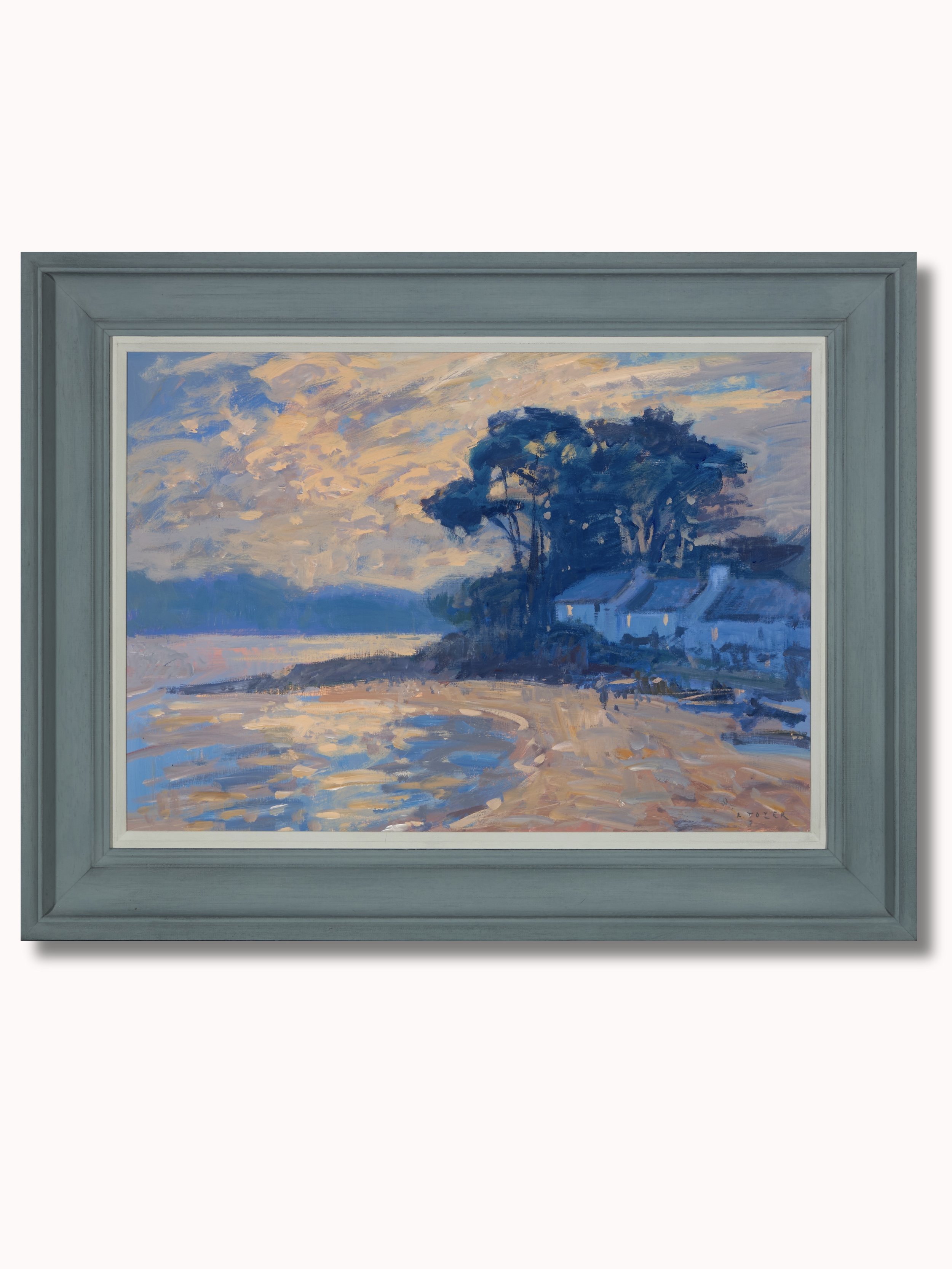 I just love the serene ‘end of day’ atmosphere in this large oil painting by the acclaimed Cornish artist, Andrew Tozer (b.1974). Painting in the en plein air tradition, Tozer skillfully captures the fleeting light and shadows as the sun sets over Helford Passage in Falmouth.